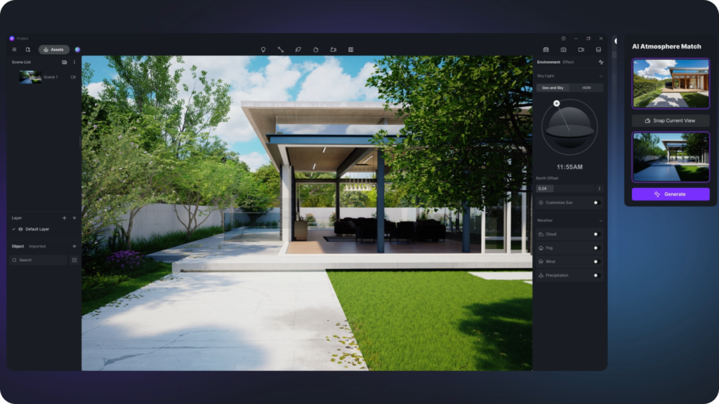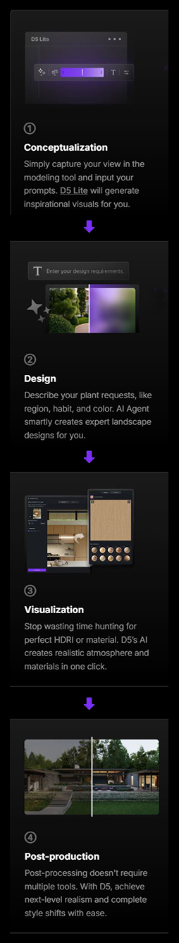 D5 Lite is embedded directly where you already work. Design, render, and iterate with AI in one seamless interface — no waiting, no breaking away. When you’re ready for the final polish, sync your entire project to D5 Render with one click.