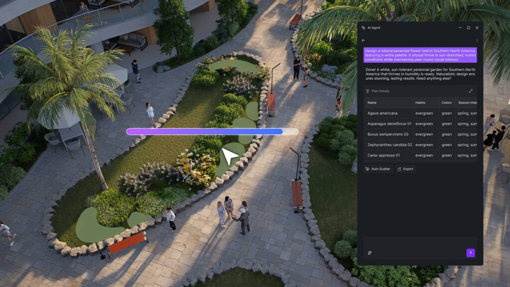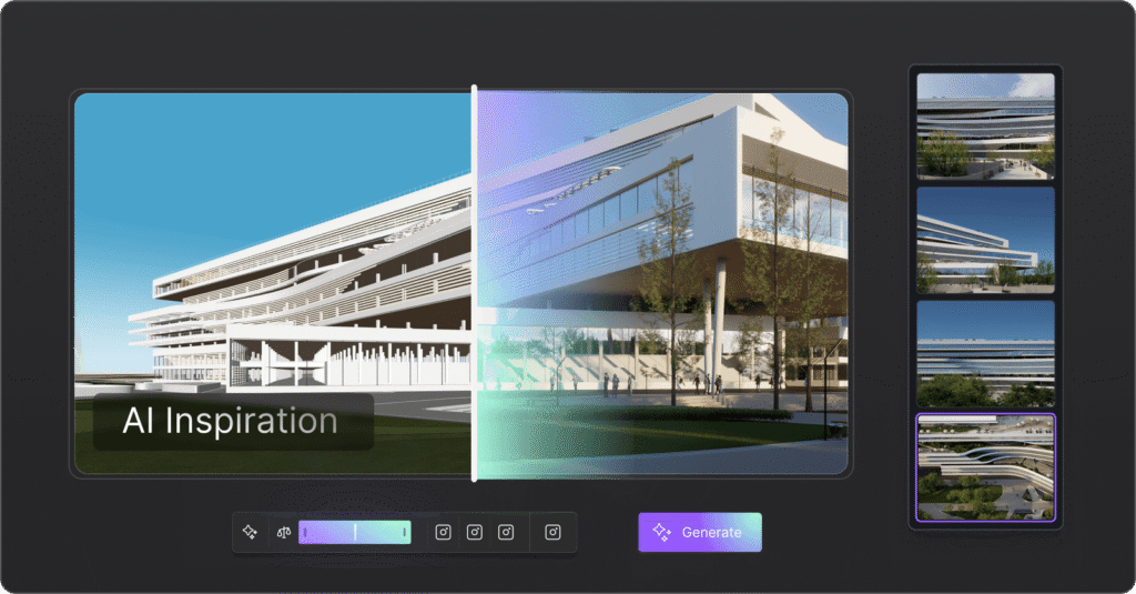 Type your intent. AI generates styled visuals — architecture, interior, landscape — based on the model you’re already building.