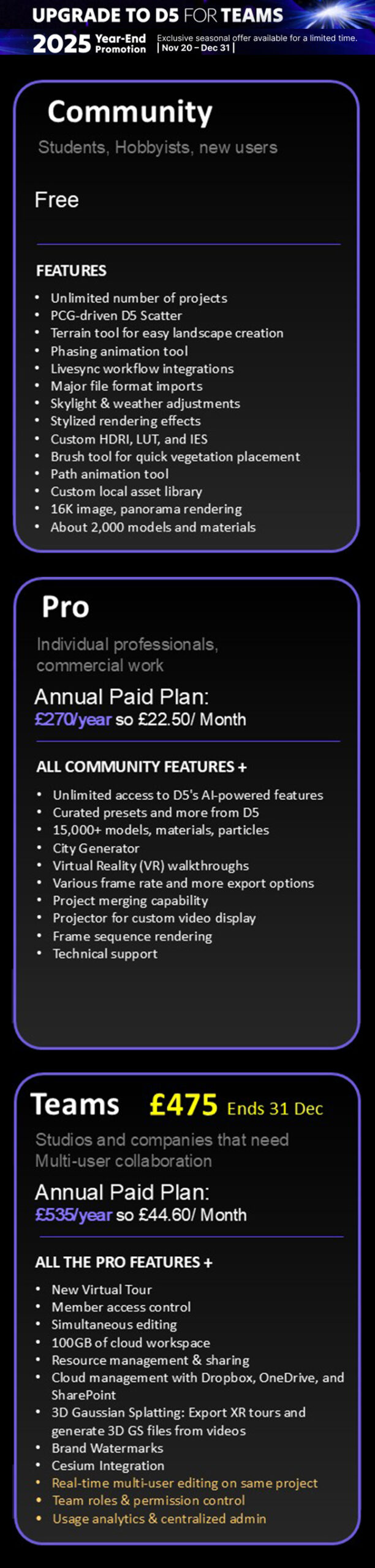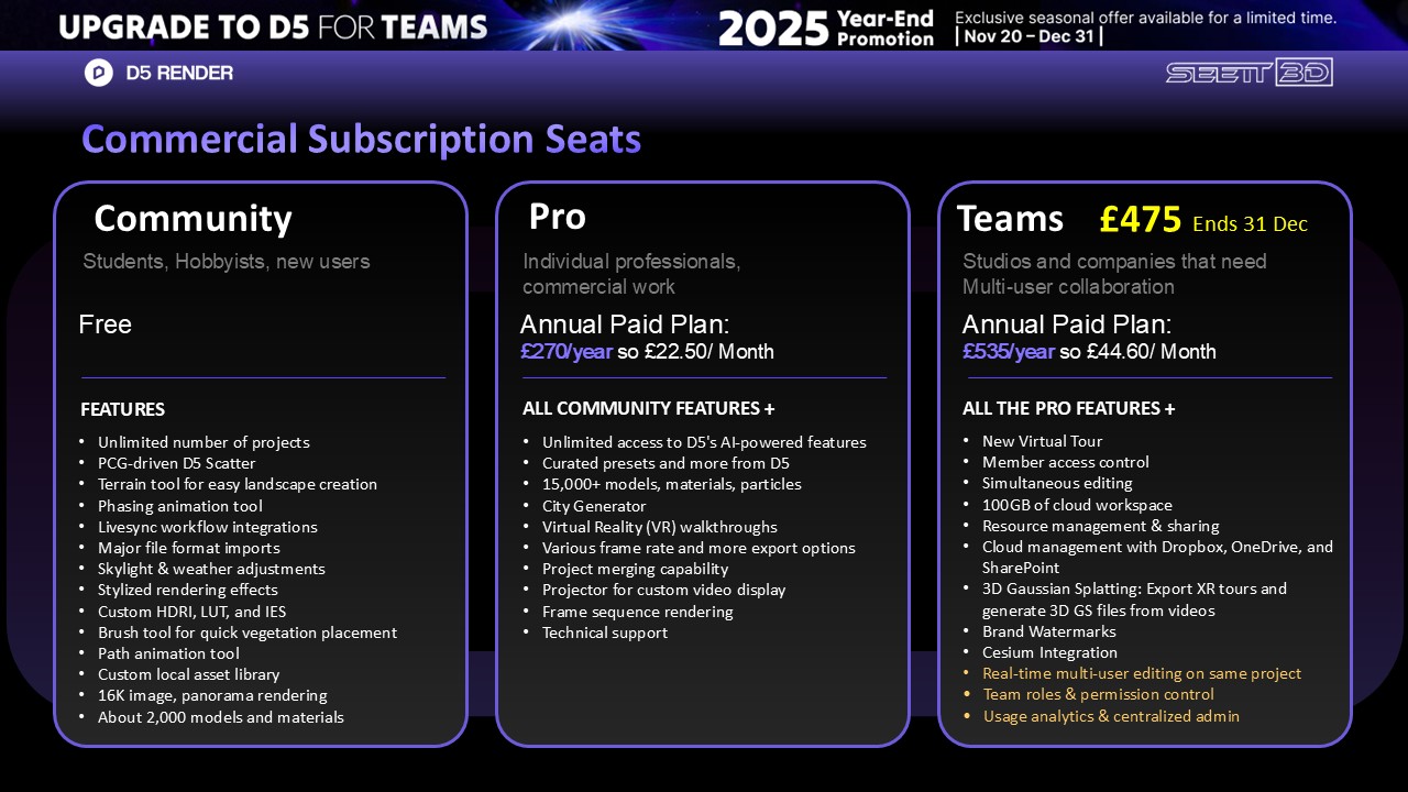 Note: XR tour + Virtual Tour currently is only for Teams. And VR features – Connect VR devices to explore and experience the scene immersively. Available for Steam VR-ready devices, such as HTC Vive, Oculus Rift, etc. This is available for both Pro and Teams.
